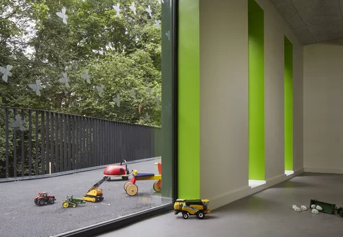 The site is adjacent to a collection of mature trees and an outdoor classroom and play area known as “the dell”. The subtle design sits almost anonymously within the trees and, as such, increases the connection between inside and outside.